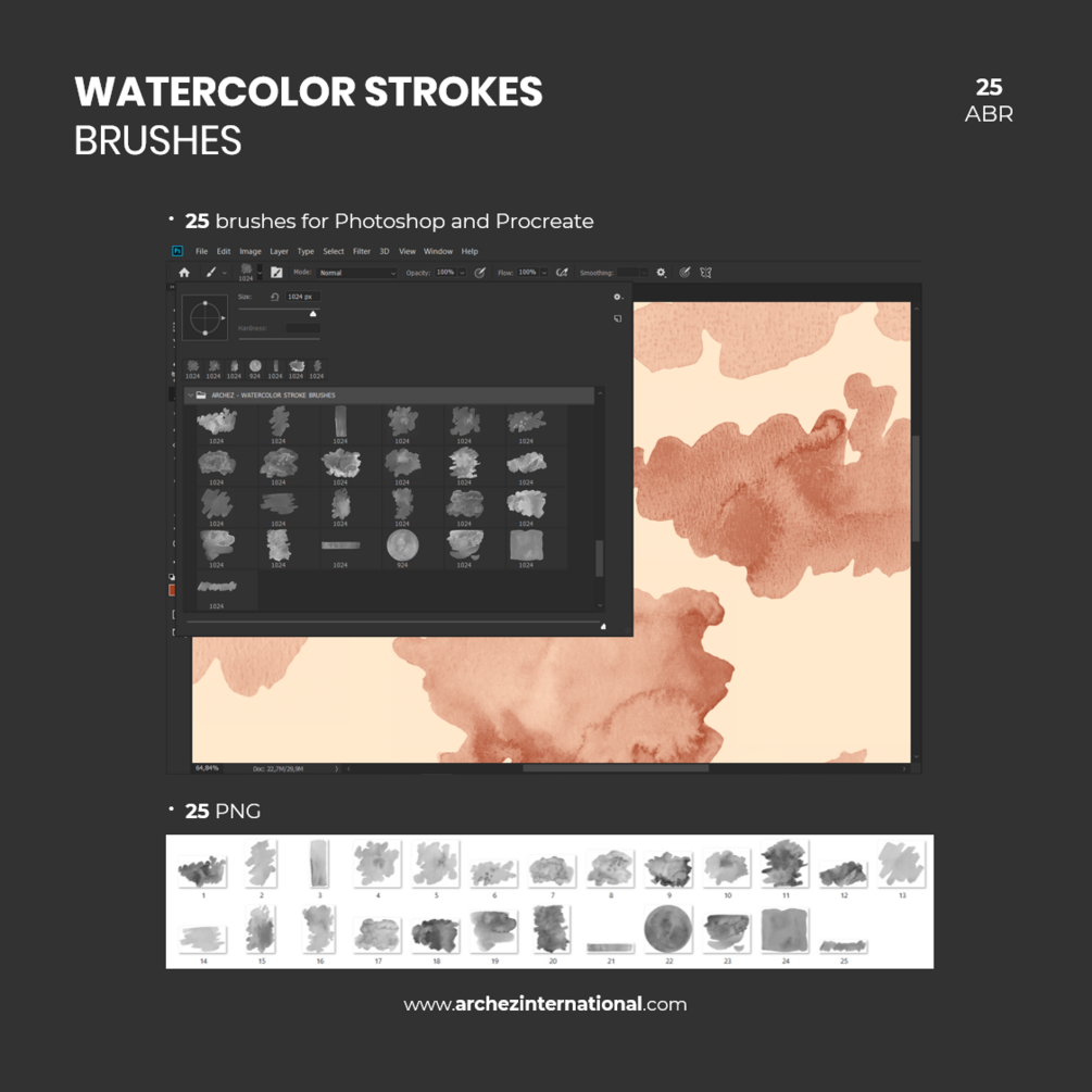 Description: Transform your architectural illustrations with our collection of 25 Watercolor Stroke brushes, each with a different kind of watercolor stroke. These brushes are designed specifically for you to personalize each detail and add unique value to all your post-productions and architectural illustrations.